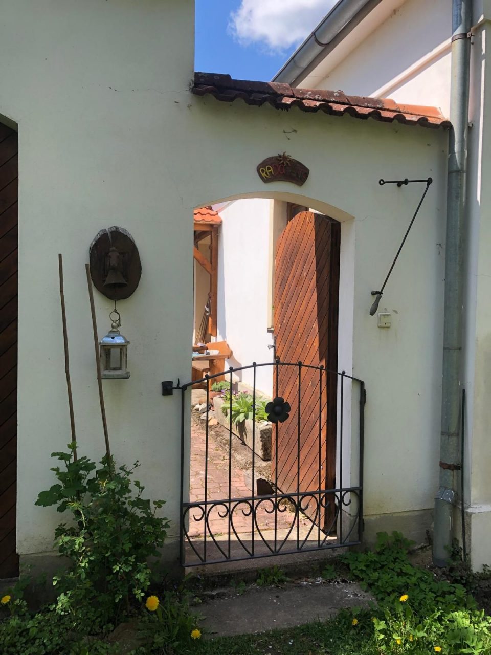 Radoléno má klasickou vesnickou předzahrádku s letitou třešní. V zadní části je dominantou letitá planá hrušeň. Je zde část pro pěstování zeleniny na zvýšených i výživových záhonech, bobulovými keři a bylinami do čajů či vaření. Součástí je i sad ovocných stromů letitých, i nově sázených. Je tu prostor pro odpočinek, kde je dominantou spirála z azalek a borovic, přírodní jezírko a ohniště. V zadní části zahrady je louka, která si žije vlastním životem a meditační háječek z náletu a sibiřských borovic. Za ním travnatá plocha k letnímu táboření.